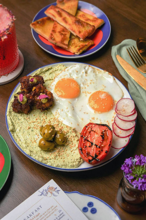 Feta Paste mixed with oregano and olive oil topped with caramelized onion, Persian cucumber and Tomato Salad, slice of avocado, sliver of baked potato, two Organic sunny side up eggs, served with sangak bread